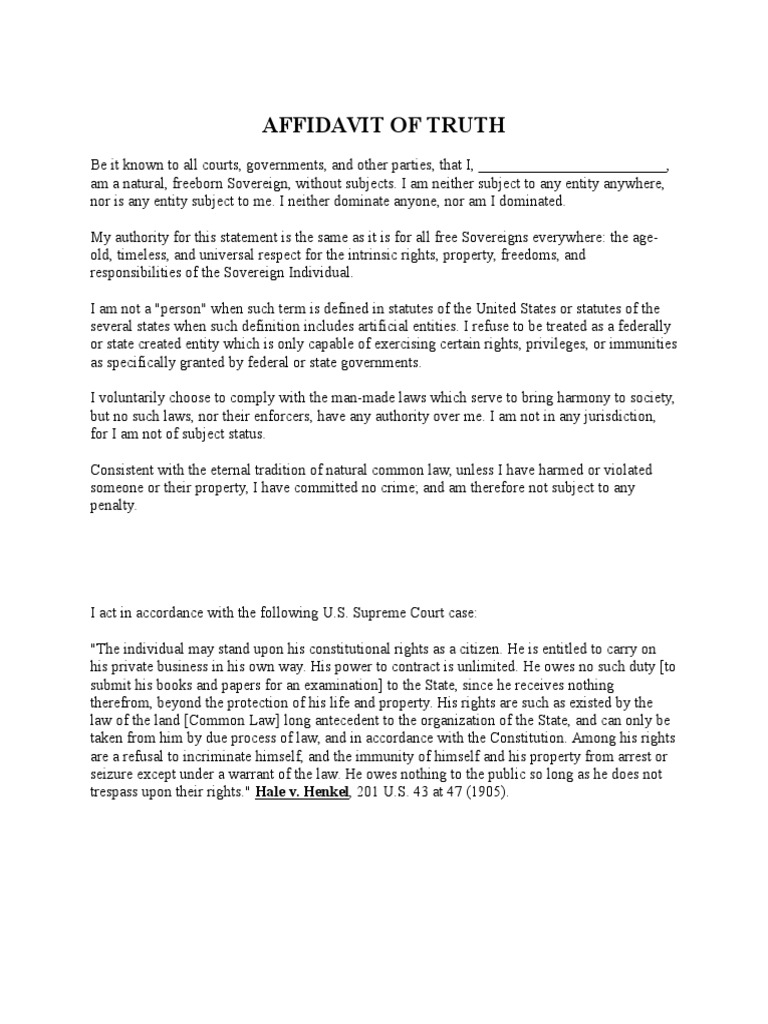 Fighting all the enemies of the constitution both enemies foreign and the most lethal domestic enemies. Affidavit Of Truth Templates - Word Excel Fomats A legal document used by an individual person to declare that he or she is a sovereign citizen of state or country. Original Driving Right Affidavit - PDF File.